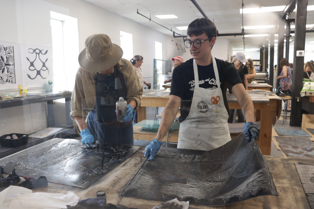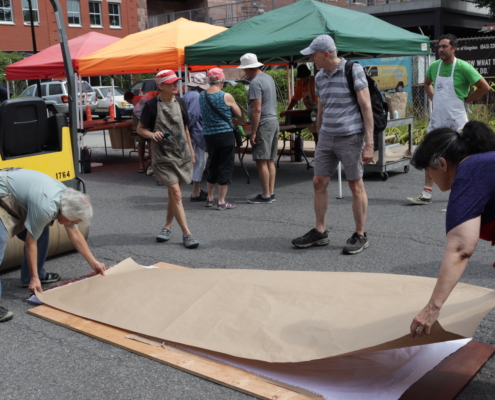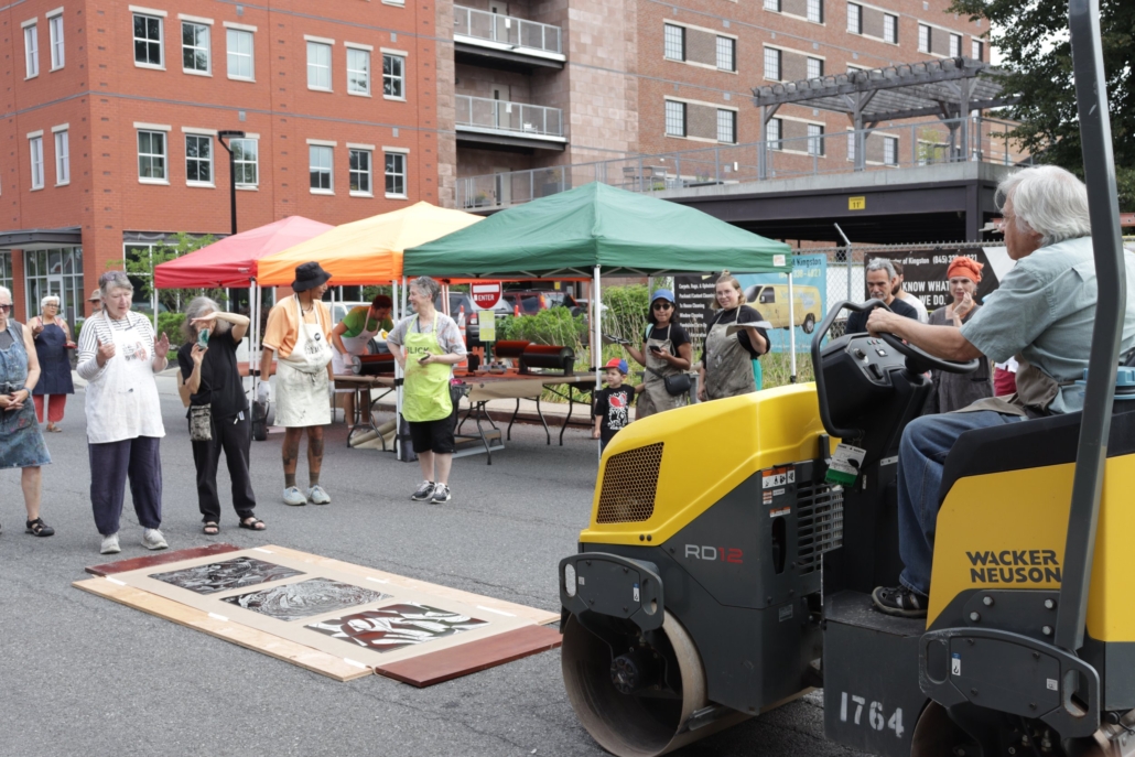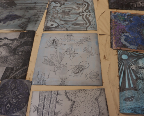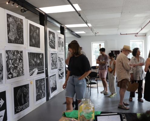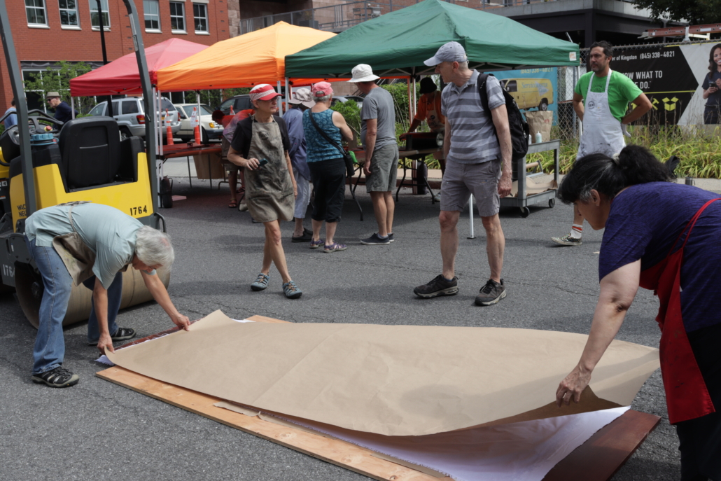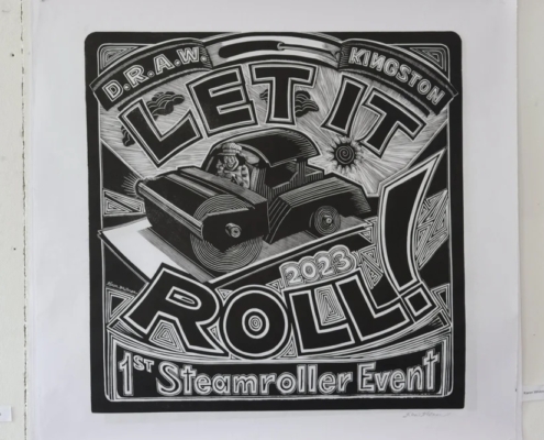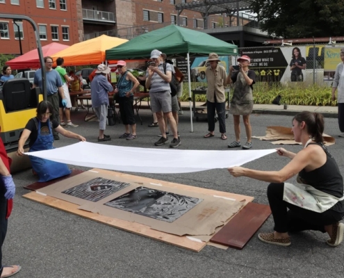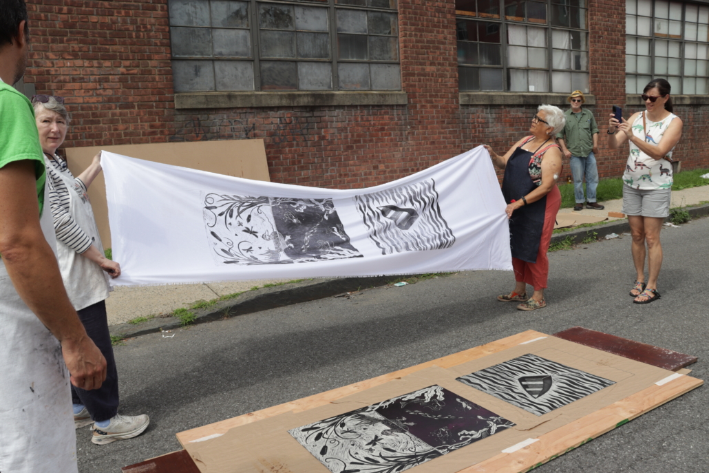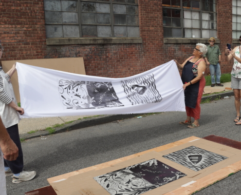 Prints were exhibited and for sale during the event, with 50% going to the artists and 50% going to help fund our new Neighborhood Print Studio. From Sunday afternoons in July through August. D.R.A.W. offered open studio time at Neighborhood Print Studio, 49 Greenkill Ave, ground floor. We welcome all ages to join in and experience it! We had 1′ x 1′ linoleum plates on site for everyone in the community to contribute to the exquisite corpse group image together and 2’ x 2’ or 2’ x 4’ for the invited artists. We printed more than 30 linocut works during the third annual DRAW-A-THON Street Block party, on August 12th.