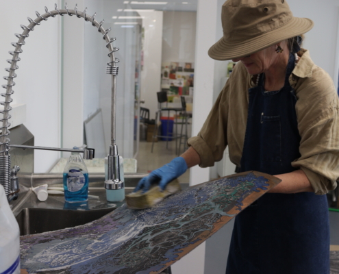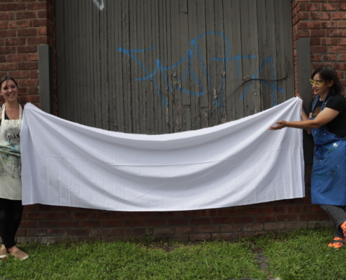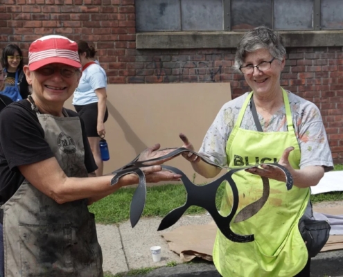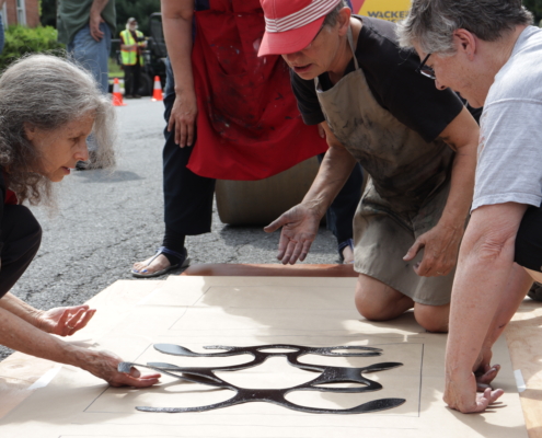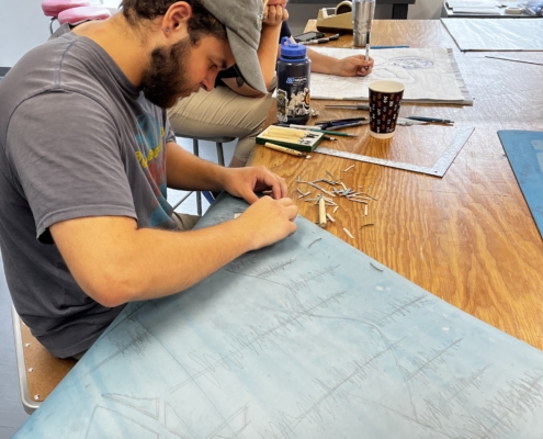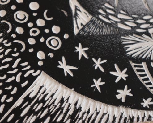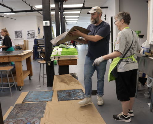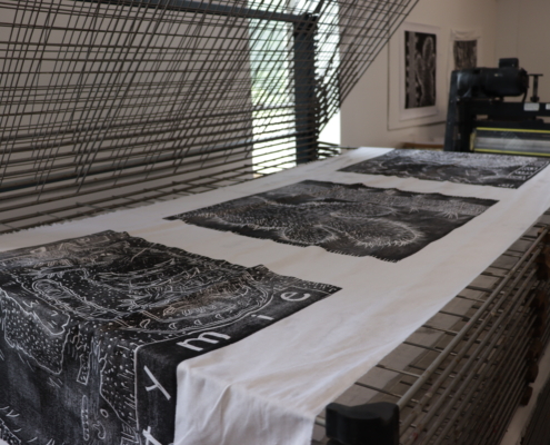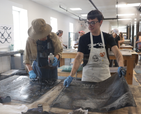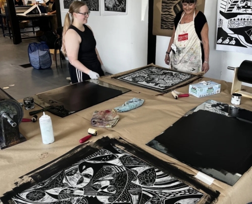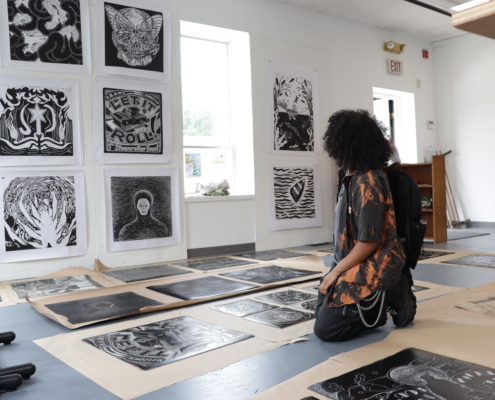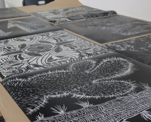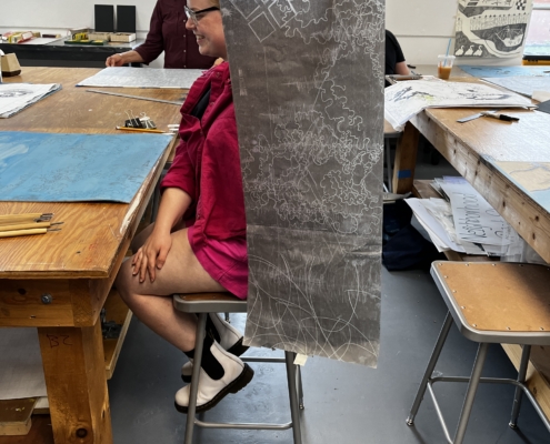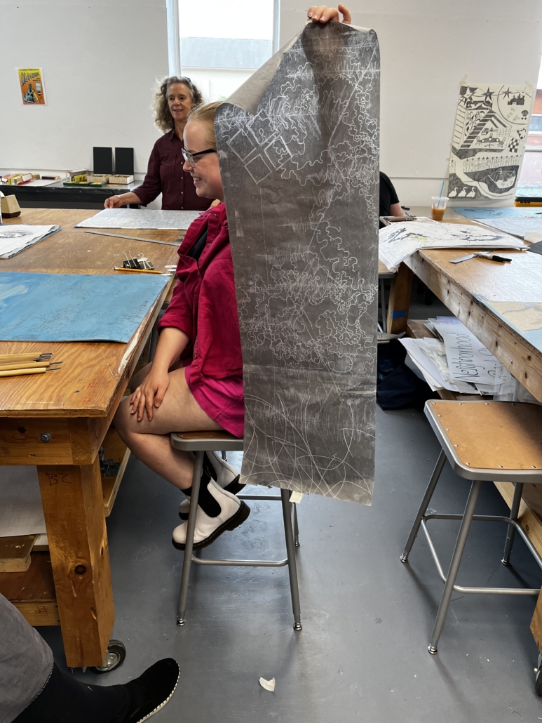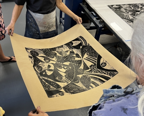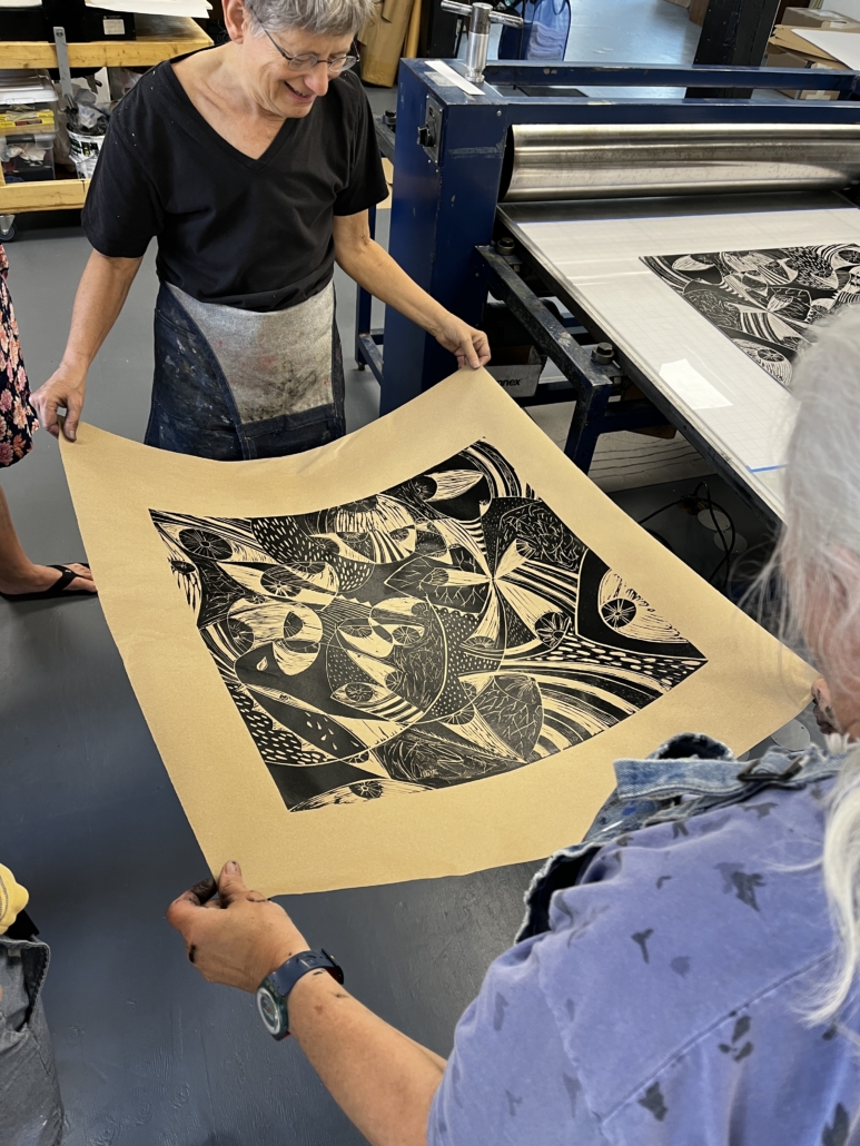Prints were exhibited and for sale during the event, with 50% going to the artists and 50% going to help fund our new Neighborhood Print Studio. From Sunday afternoons in July through August. D.R.A.W. offered open studio time at Neighborhood Print Studio, 49 Greenkill Ave, ground floor. We welcome all ages to join in and experience it! We had 1′ x 1′ linoleum plates on site for everyone in the community to contribute to the exquisite corpse group image together and 2’ x 2’ or 2’ x 4’ for the invited artists. We printed more than 30 linocut works during the third annual DRAW-A-THON Street Block party, on August 12th.
